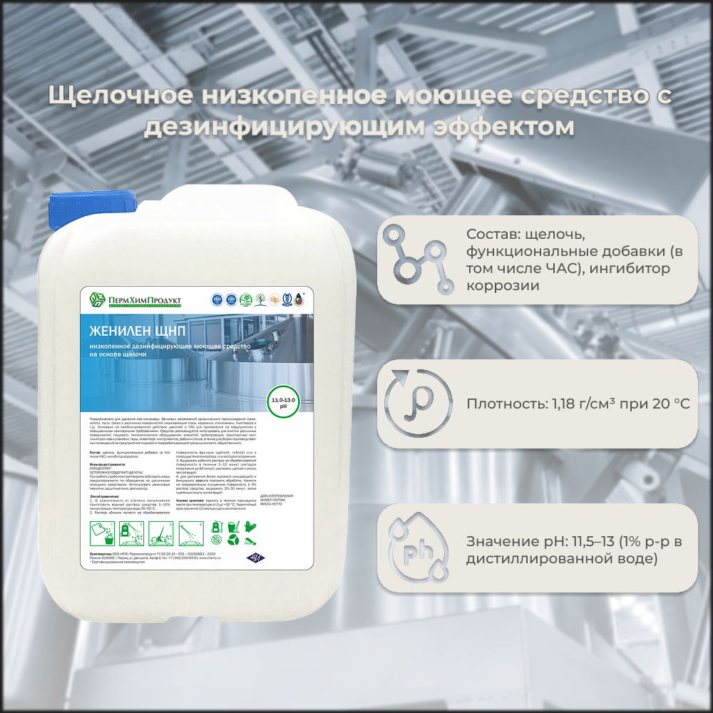 Моющее средство Женилен СИП Щ щелочное низкопенное объемом 10 литров — это профессиональное универсальное средство для дезинфекции с моющим эффектом. Продукт специально разработан для предприятий с повышенными санитарными требованиями в пищевой, перерабатывающей промышленности и медицинских учреждениях.