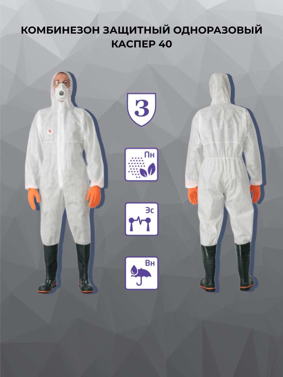 Комбинезон защитный одноразовый КАСПЕР 40, цвет белый, идеально подходит для профессиональной защиты кожи и специальной одежды от промышленных, пищевых и биологических загрязнений. Этот надёжный защитник обеспечит вам спокойствие и комфорт в течение всего рабочего дня.
