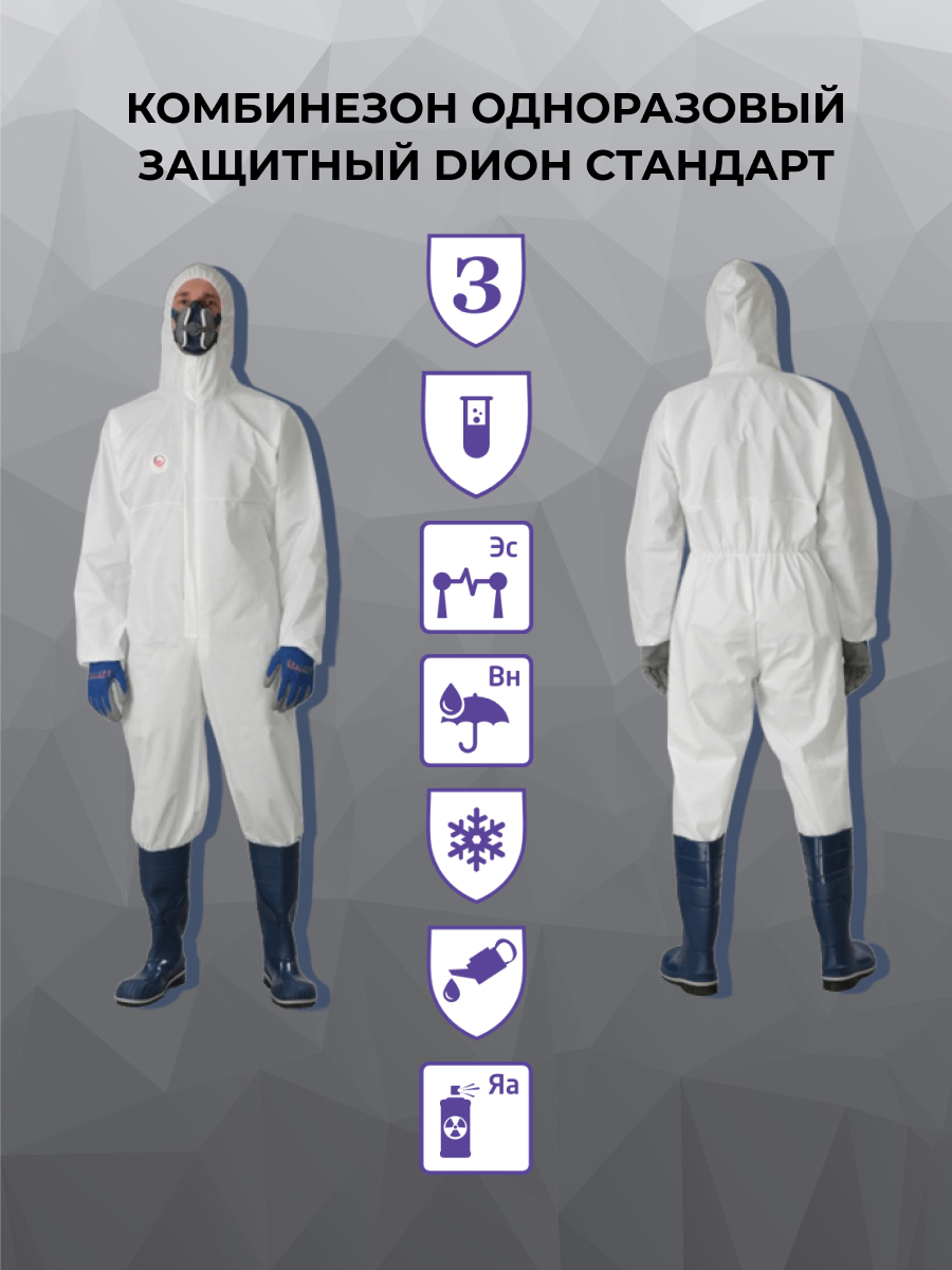 Конструкция комбинезона продумана до мелочей: наличие капюшона обеспечивает защиту головы, застёжка на тесьму «молния» с планкой гарантирует герметичность, а рукава и низ брюк с эластичной лентой обеспечивают комфорт и свободу движений. DИОН СТАНДАРТ — ваш выбор для надежной защиты!